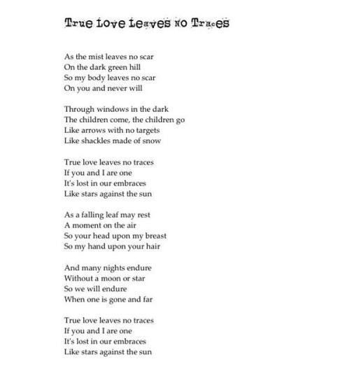 True love leaves no traces, If you and I are one. It’s lost in our embraces, Like stars against the sun.